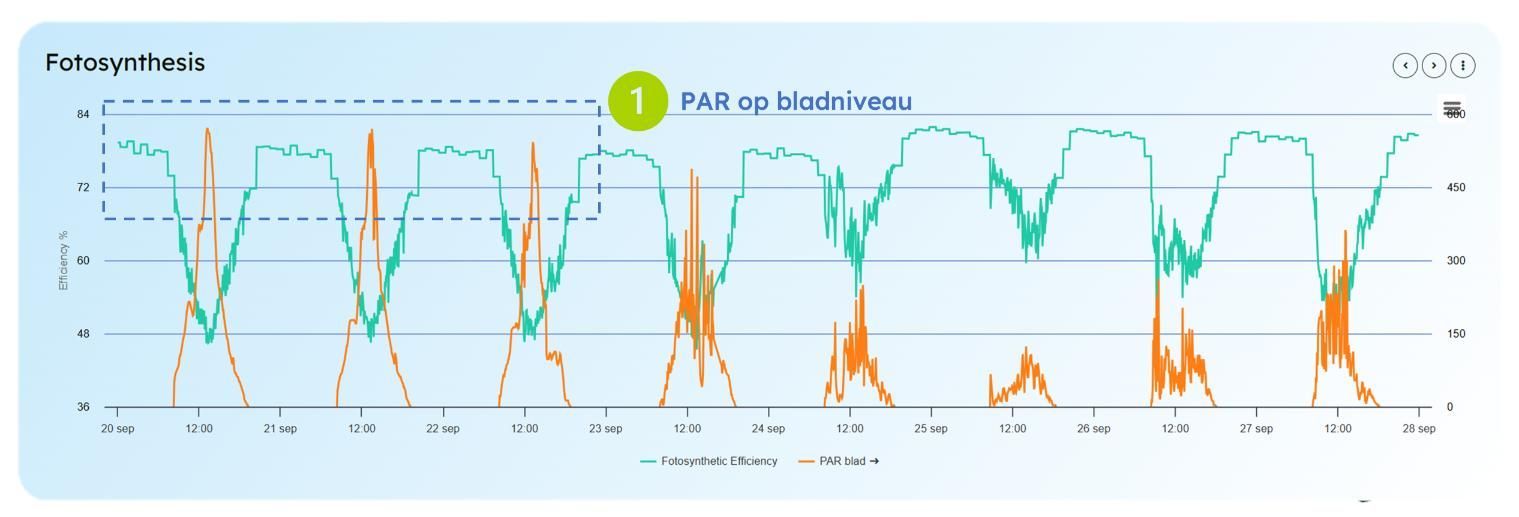 Bovenstaande grafiek bestaat uit twee lijnen. De oranje geeft het aantal PAR aan, gemeten op bladniveau. De groene lijn geeft de fotosynthese efficiëntie aan. Als we kijken naar de periode van 20 tot en met 23 september (grafiek 1, nummer 1) zien we dat het gewas werd blootgesteld aan een hoge hoeveelheid licht. Gemiddeld ontving het gewas op bladniveau 200 µmol/m²/s. Op sommige momenten werd het gewas zelfs blootgesteld aan bijna 600µmol/m²/s.